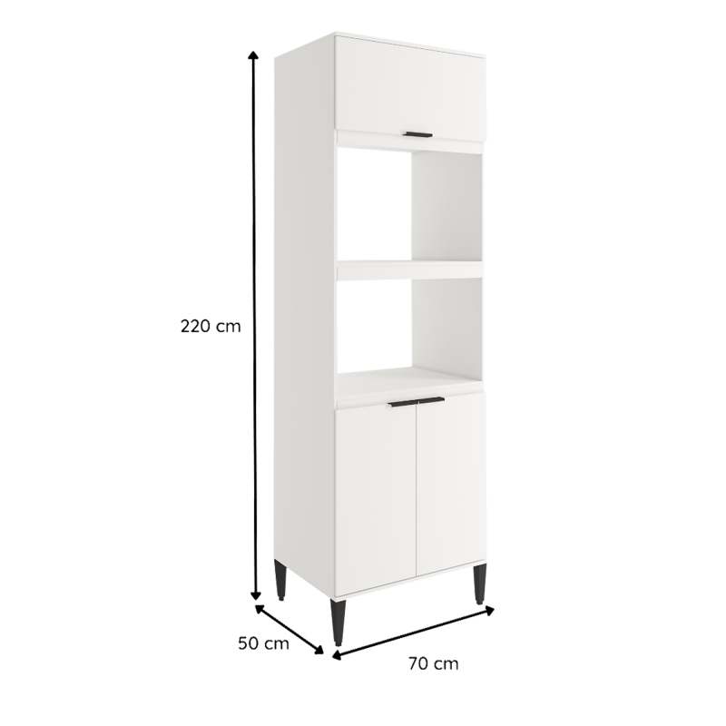 Mueble Alacena Despensa 70cm con dos nichos para Microondas, horno, air fryer o decoraciones. Marca Bertolini -Producto desarmado. -3 Puertas. -2 nichos y 3 compartimientos internos para almacenar. -Medidas: Alto: 220cm (incluyendo patas) - Profundidad: 50cm - Ancho: 70cm -Material del mueble MDP 15mm con acabado de pintura UV - Bisagras metálicas. Patas plásticas ajustables de 1 a 3cm. - Manijas de aluminio. - Acabado de lino en el interior. Description: EN Bertolini, pensamos en ti y la comodidad de tu hogar, Los módulos Alpha, combinan versatilidad y creatividad, permitiendo tenerlas en diversos espacios. esta hermosa Alacena en MDP que cuenta con diversos compartimientos para almacenar tus alimentos, utensilios de cocina y muchos más, además cuenta con un nicho para objetos decorativos y darle ese toque especial a tu cocina o cuarto de labores, adicionalmente tiene dos compartimientos para colocar tu horno, microondas, air fryer u otros elementos. RECOMENDACIONES: -Limpiar con jabón suave, no utilizar esponjas abrasivas, preferiblemente paños humedecidos, evitar excesos de agua GARANTÍA: 6 meses. El tono de la imagen puede tener alguna variación leve.