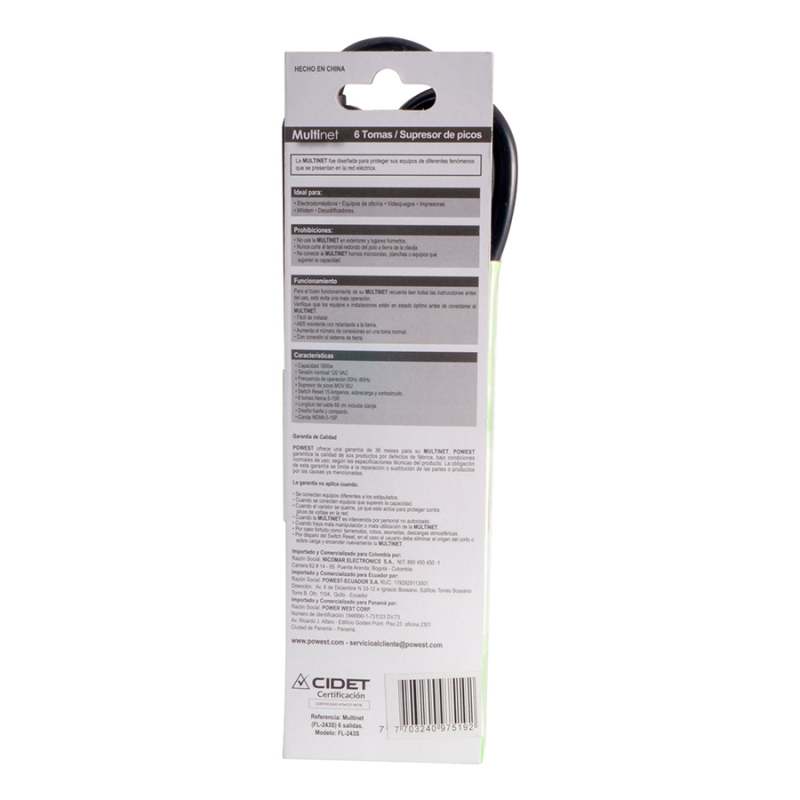 Multitoma multinet supresor de picos 6 tomas 1800w la supresión de sobretensiones blinda a los equipos contra las sobretensiones más fuertes y aumenta el número de periféricos a conectar. cable de poder. el interruptor de alimentación integrado y el interruptor de circuitos de 15 AMP. ofrecen control de energía y protección contra sobrecarga en todos los tomacorrientes y protección para niños. dispositivo diseñado para aumentar el número de periféricos a conectar en un punto eléctrico durable, resistente y no inflamable. la mejor protección a equipos eléctricos electrónicos y personas ante fallas o tormentas eléctricas. •capacidad 1800w •tensión nominal 120 vac •frecuencia de operación 50hz / 60hz •Swich Reset 15 amperios, sobrecarga y cortocircuito • 6 tomas nema 5-15r • longitud del cable 68 cm incluida clavija •clavija nema 5-15 p• disminución de la operación anormal de equipos eléctricos y electrónicos durante tormentas o fallas eléctricas• diseño compacto y liviano.• fácil de instalar, orifico para instalación en pared.• prolonga la vida útil de sus equipos.•3 años de garantía