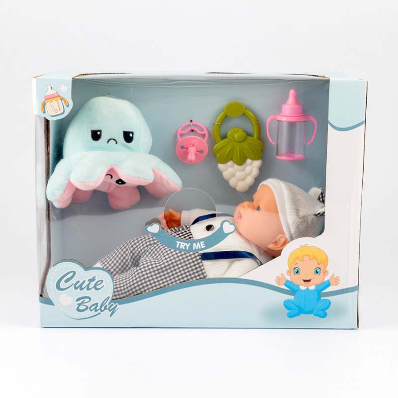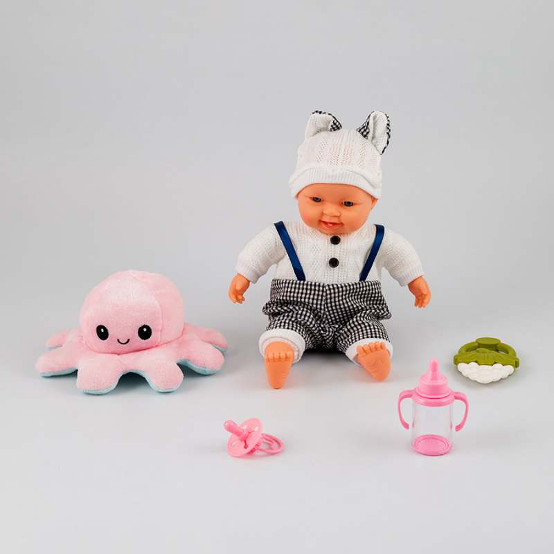 Adorable y realista muñeco bebé, diseñado con materiales de calidad, hermoso atuendo, su extructura garantiza que el infante pueda jugar en cualquier lugar, interior o exterior sin preocuparse, fáciles de lavar, promueve la creatividad e imaginación, perfecta para fomentar el juego de rol, incluye 1 pulpo de felpa, 1 botella, 1 chupete, 1 bolso, utiliza 3 pilas AG13, dimensiones del producto 36.5X16.5X28 cm. Edad recomendada de uso mayor de 3 años.