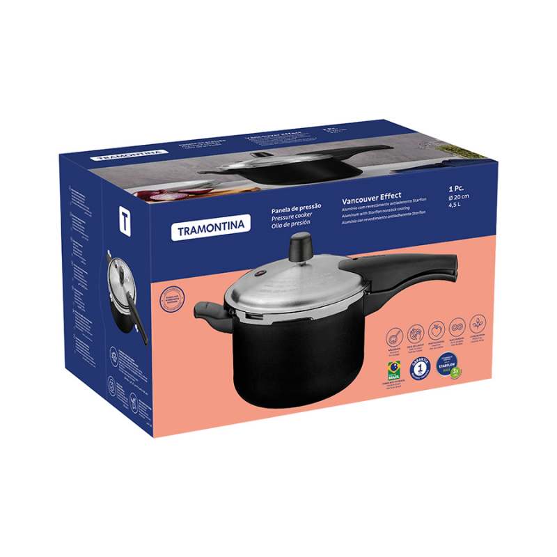Olla a presion con cuerpo de aluminio, espesor de 3,2 mm, revestimiento interno y externo antiadherente Starflon Max que no se pega, proporciona una cocción rápida y uniforme, fácil de limpiar y duradero, asas, superiores e inferiores fabricadas en Baquelita resistente al calor que ofrecen seguridad durante el manejo. Uso en estufas de gas, eléctricas, vitrocerámicas - resistencia eléctrica.