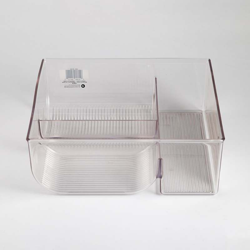 Organizador Interdesign. Cuadrado. Dividido en tres compartimentos. Fabricado en acrílico transparente, cuenta con medidas 29 x 27.7 x 10.4 cm. Peso de 0,01 kg, Diseñado para guardar tapas, organizar sartenes, utensilios de la cocina u otros espacios, como tú nevera, alacena entre muchos otros. Su diseño compacto y funcional permite un acceso rápido a los objetos, ofrece durabilidad, facilita la visualización del contenido almacenado y se adapta fácilmente a espacios reducidos.