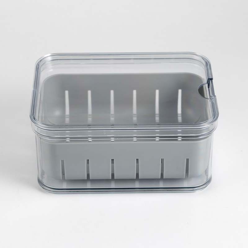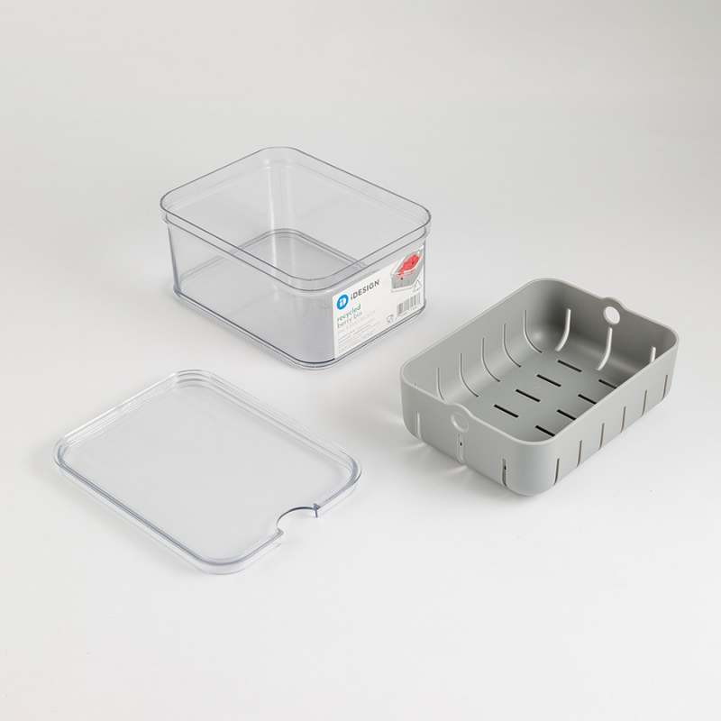 Organizador Interdesign. Cuadrado con Tapa (orificio lateral), color Transparente. Lo cual permite acceso de aire), En su interior trae rejilla escurridora – Cuadrada en color – Gris, permitiendo aislar los alimentos de la humedad y el líquido que se acumulan en el fondo permitiendo que el aire circule y manteniendo las frutas, verduras y lácteos como bloque de queso, por más tiempo frescos adicional mantenerlos seguros de la contaminación cruzada. • Está elaborado en acrílico transparente y ofrece una solución resistente, práctica y estética para organizar espacios del hogar, especialmente la cocina tales como nevera, alacena u otros. permite almacenar y visualizar fácilmente utensilios o productos de uso diario. Su diseño moderno, liviano y funcional se adapta a cualquier entorno. Medidas: • 20.3 x 25.4 x 12.7 cm • Peso de 0,58 Kg.