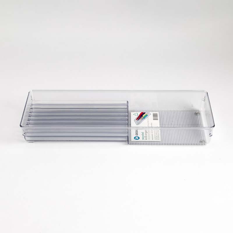 Organizador Interdesign, fabricado en material acrílico transparente, con medidas de 15,01 cm de frente, 5,03 cm de alto y 41 cm de fondo. Diseñado para mantener tus cuchillos ordenados, cuenta con ranuras en las cuales puedes ubicar tu utensilio de manera segura. Sus paredes bajas y su tamaño ideal lo hacen ideal para muchos cajones, cuenta con patas antideslizantes en la base para evitar que se deslice dentro del cajón o sobre la encimera. Combina resistencia, durabilidad y facilidad de limpieza.