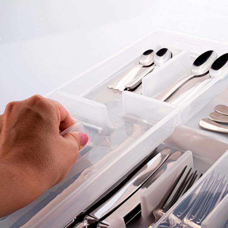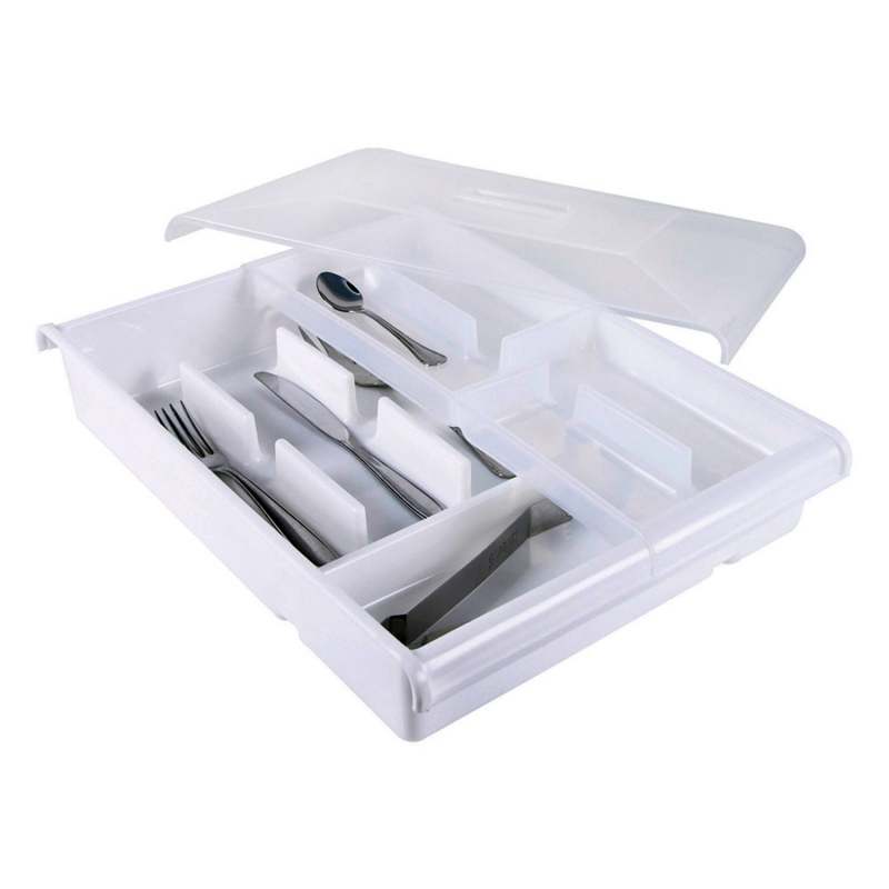Porta cubiertos grande com 5 divisiones y tapa transparente para una fácil visualización de los cubiertos.