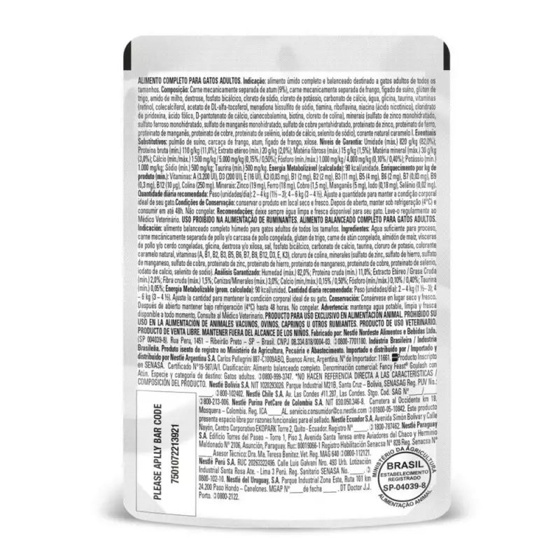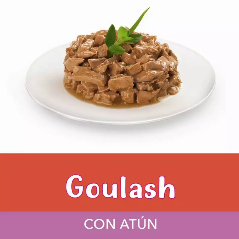 Saborea el delicioso Fancy Feast Goulash con atún, un alimento húmedo premium para gatos adultos. Este pouch de 85 g ofrece trozos suaves de atún en salsa cremosa, sin colorantes artificiales, formulado para brindar nutrición completa y balanceada. Ideal para momentos de mimos o para complementar su dieta seca.