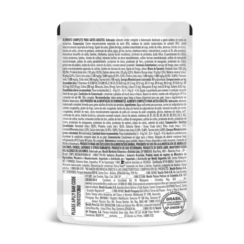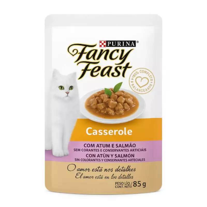 Fancy Feast Casserole Atún y Salmón es un alimento húmedo irresistible para gatos adultos, que combina trozos tiernos de atún y salmón en una salsa apetitosa. Elaborado sin colorantes artificiales, brinda una experiencia gourmet bajo el respaldo de Purina, en un práctico formato de 85 g.