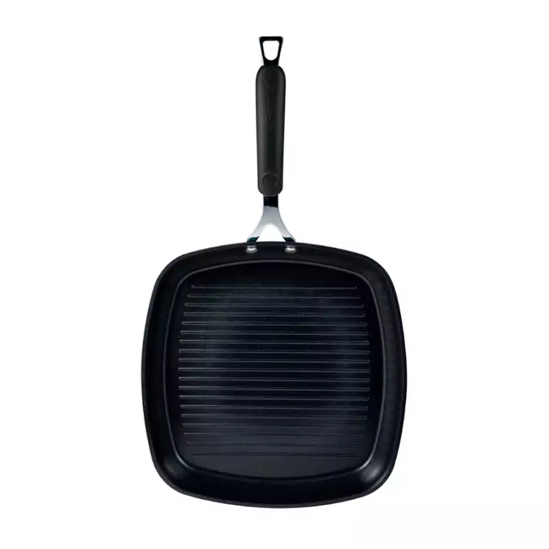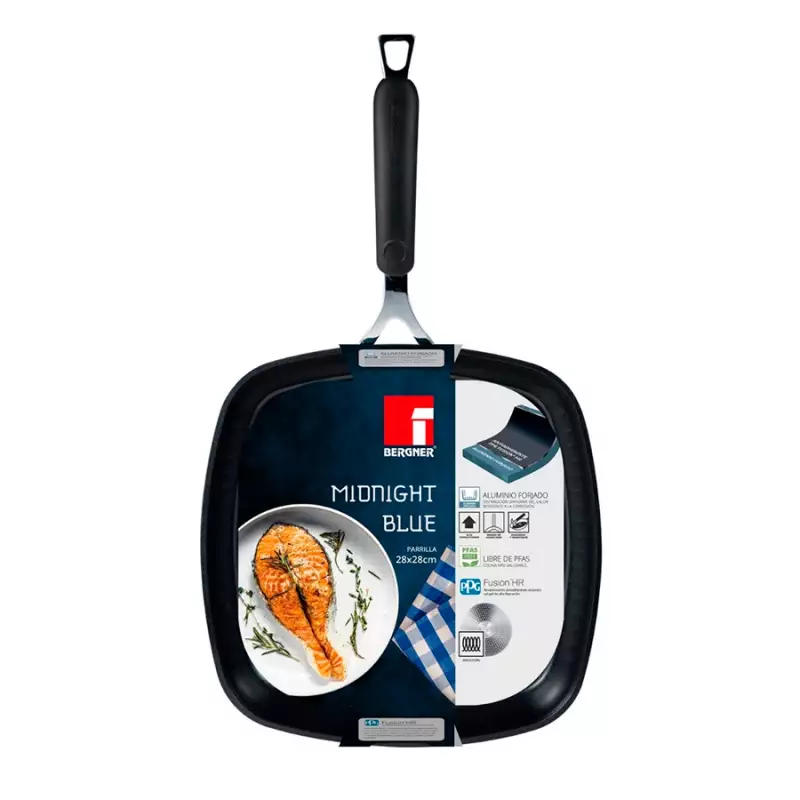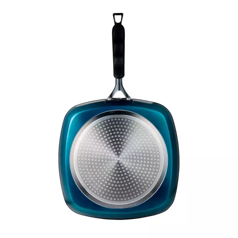 Asador Azul 28X4,5 cm fabricado en aluminio forjado de doble capa con antiadherente cerámico ppg fusion libre de tóxicos (pfas free) mango en acero inoxidable con recubrimiento en silicona suave al tacto, manteniendo asas frías, resistente cuerpo fabricado en aluminio forjado 3.5 mm, distribución uniforme del calor y ahorro de energía, base de inducción con partículas de acero apta para todas las cocinas ( gas, vitro, inducción, eléctrica), resiste a arañazos y corrosión.
