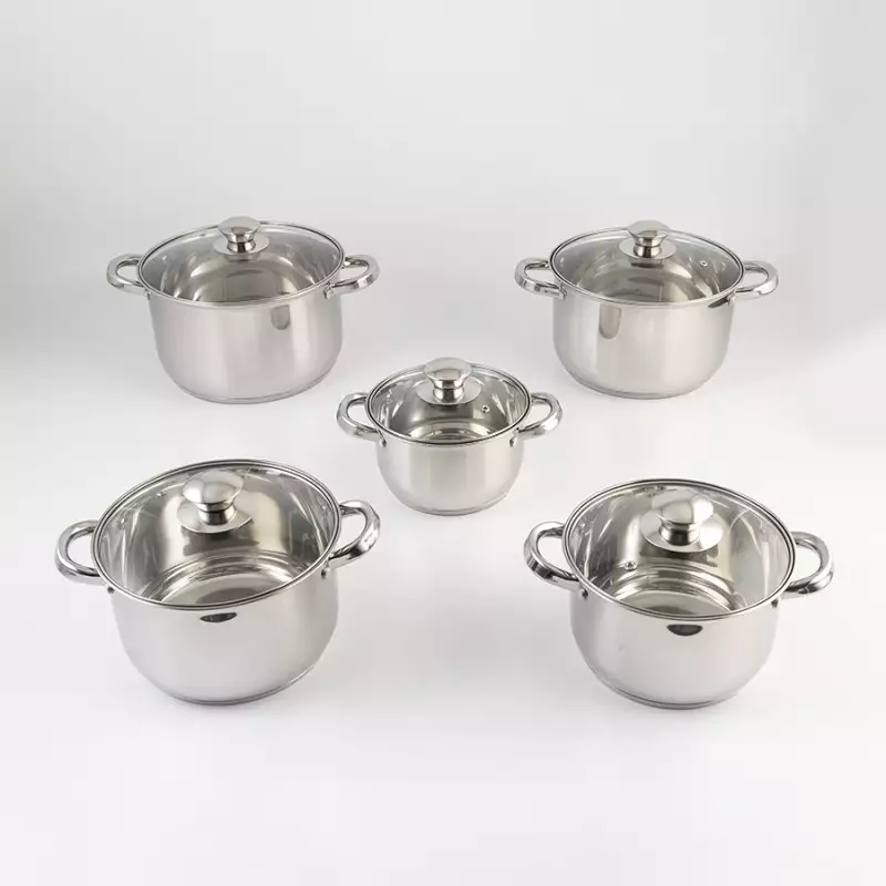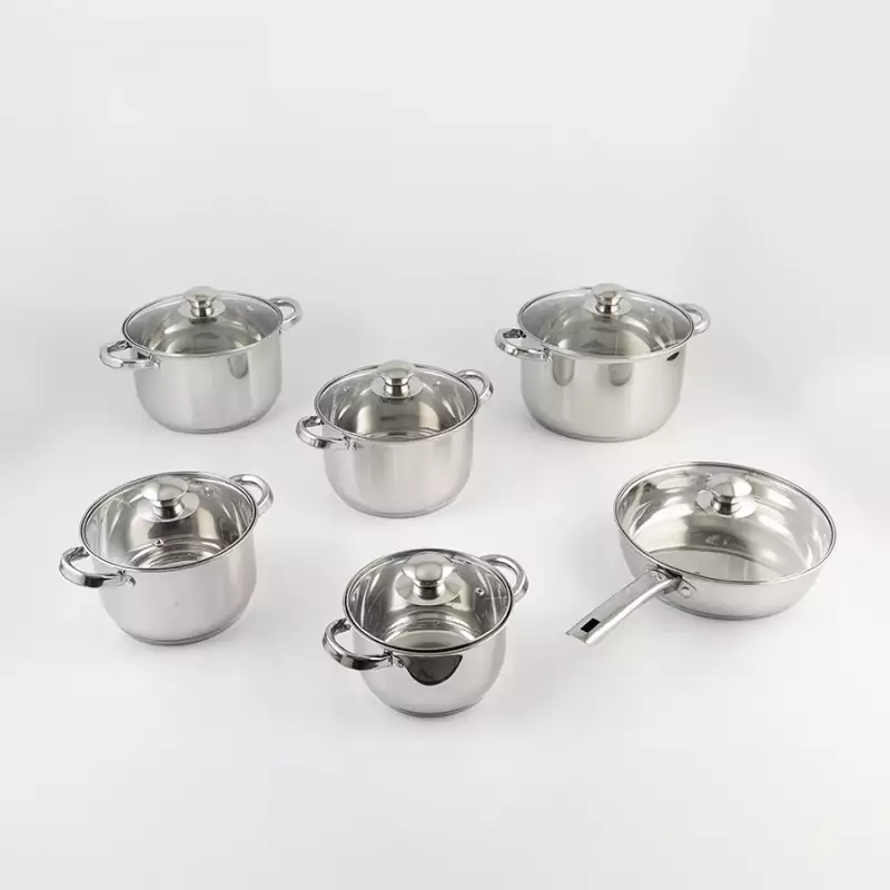 Batería de Cocina 12 Piezas: Elaborado en acero inoxidable, espesor de pared 0.45 mm, doble fondo, y fondo de inducción, agarraderas de acero Inoxidable y tapas de vidrio templado. Contiene: - 1 Cacerola 16 x 9.5 cm + Tapa de vidrio templado por 16 cm. - 1 Cacerola 18 x 10.5 cm + Tapa de vidrio templado por 18 cm. - 1 Cacerola 20 x 11.5 cm + Tapa de vidrio templado por 20 cm. - 1 Cacerola 22 x 12.5 cm. + Tapa de vidrio templado por 22 cm. - 1 Cacerola 24 x 14 cm + Tapa de vidrio templado por 24 cm. - 1 Sartén 24 x 6.5 cm + Tapa de vidrio templado por 24 cm. Apto para: - Quemador de gas. - Eléctrico. - Inducción. - Halógeno. - Lavavajillas. - Resistente al frío.