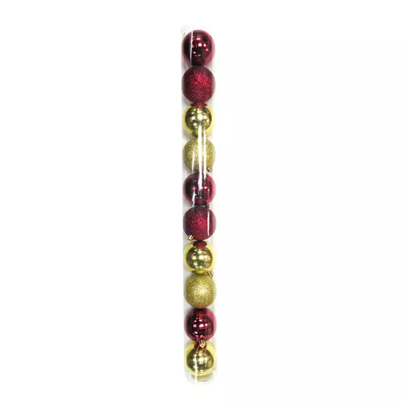 10 bolas navideñas para decorar el arbol 7cm, color dorado y vino tinto. Material plástico resistente, ideal para decoración de navidad. No es un juguete, no acercar el producto al fuego