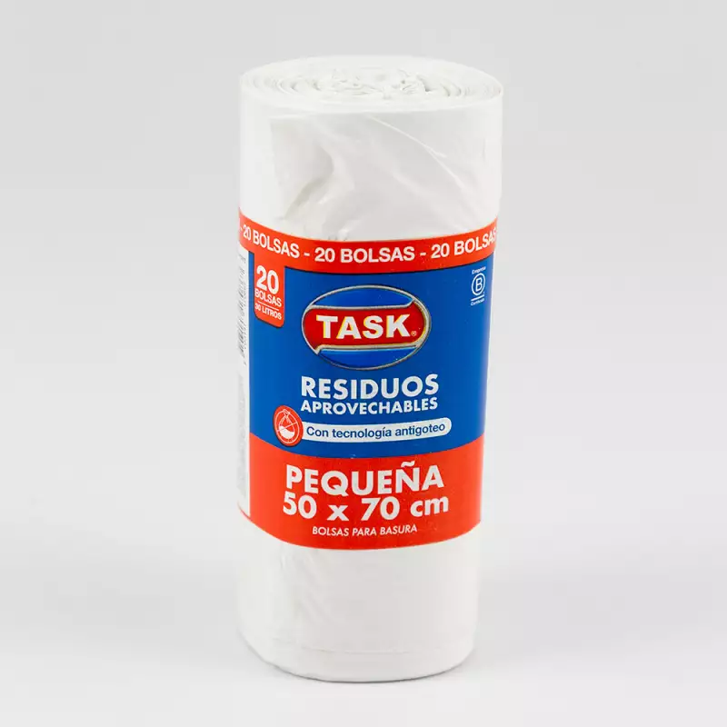 Bolsas de basura TASK en tamaños compactos, ideales para manejo de residuos domésticos.