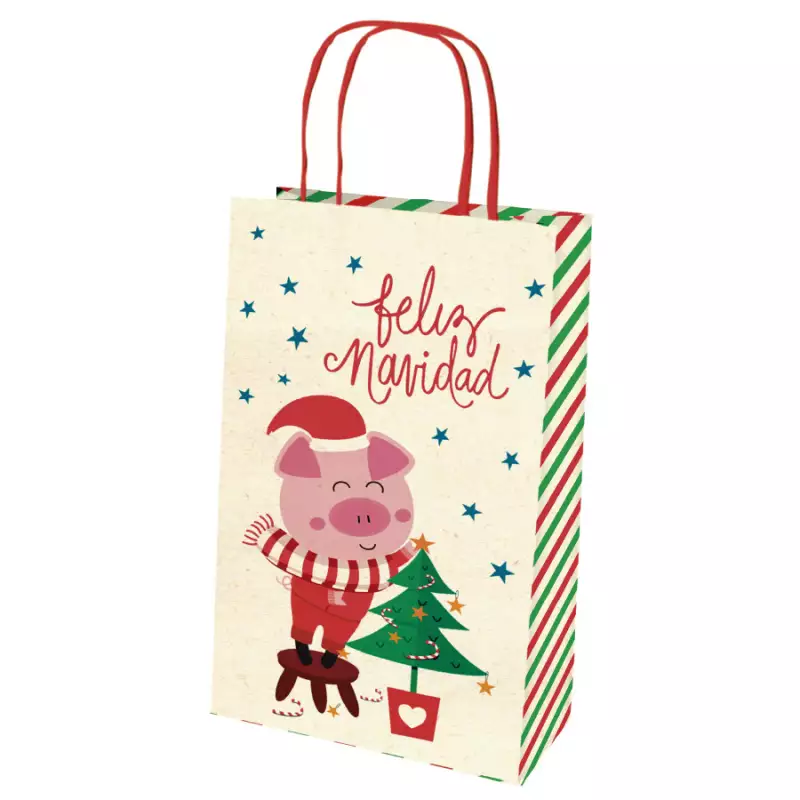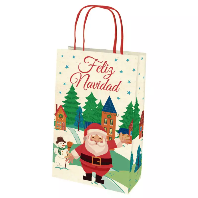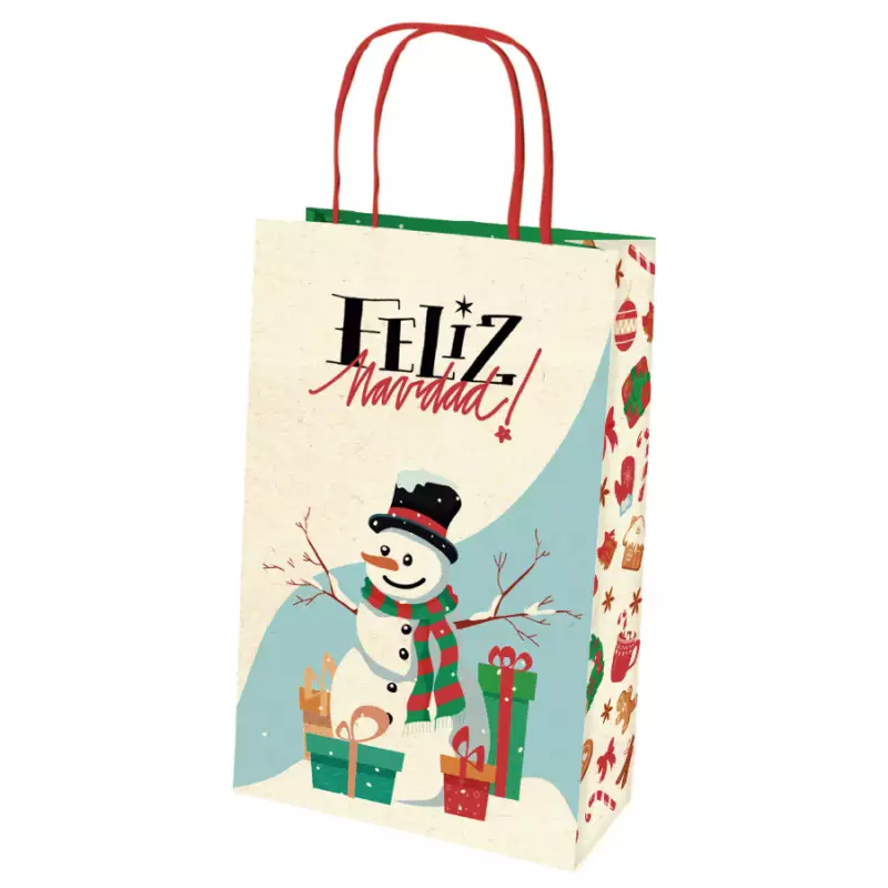 Bolsa de regalo tamaño 16x25,5x7,5cm, impresa sobre papel earthpact con manijas en cordón. Motivo Navidad. Diseños surtidos