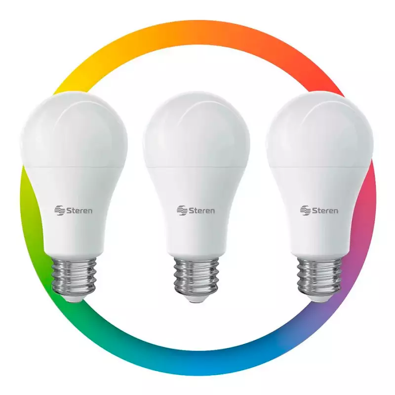 ¡Convierte tu casa en una Smart Home y ambienta sus espacios con iluminación multicolor! Luz multicolor: Adapta la iluminación de tus espacios con los miles de matices que te ofrecen sus LED RGB. Luz fría: Para que tengas más claridad en tus espacios de trabajo puedes aprovechar sus LED de luz fría. Luz cálida: Tus espacios de relajación y confort serán más agradables gracias a sus LED de luz cálida. Gran iluminación: Su intensidad luminosa es de hasta 900 lm y mantienen un bajo consumo de energía, solo 10 W Función audio rítmica: ¡Crea una atmosfera de fiesta! Configura los focos para que enciendan en distintos colores al ritmo de la música que pongas. Conexión Wi-Fi: Los focos se vinculan por Wi-Fi en redes de 2,4 GHz, lo que asegura gran alcance inalámbrico. App Steren Home: Su uso se administra por medio de nuestra app Steren Home, desde donde puedes cambiar el color o intensidad de la iluminación, controlar el encendido y apagado instantáneo o por programación de horarios y rutinas, compartir el control con otros usuarios y mucho más. Control por voz: Pide a los asistentes Alexa* y Google Assistant* prender o apagar, ajustar la intensidad y cambiar el color de los focos, entre otras funciones. Compatibilidad: Tienen terminal E27, por lo que solo necesitas colocar este foco en cualquier socket estándar. Voltaje de operación: 100 - 240 Vca 50/60 Hz 0,1 A Potencia: 10 W Flujo luminoso: 800 - 900 lm (luz de día) Tiempo de vida: 20 000 h Frecuencia Wi-Fi: 2,4 GHz Estándar: IEEE 802.11 b/g/n Terminal E27 No debe usarse con atenuadores de luz