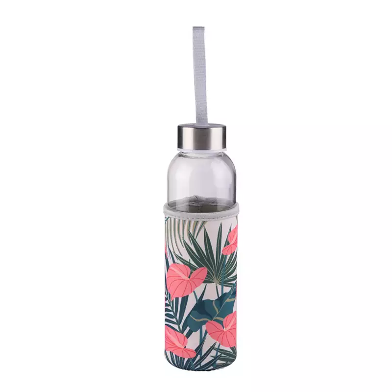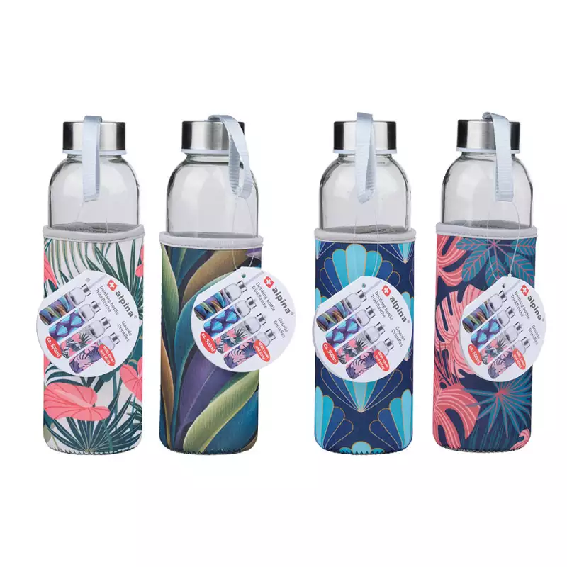Botella Alpina Transparente De 500 Ml, Fabricada En Vidrio. Cuenta Con Tapa De Rosca Y Correa Para Transporte. Incluye Funda Para La Botella En Diseños Y Colores Surtidos, Con Estampados Abstractos Y De Hojas. La Funda Estampada Le Da Un Aspecto Único Y Moderno, Además De Ofrecer Protección. Ya Sea Que Estés De Viaje, En La Oficina O En El Gimnasio, La Botella De Agua Alpina Es Tu Compañera De Confianza. El Vidrio Garantiza Un Sabor Puro Y Representa Una Alternativa Ecológica A Las Botellas De Plástico. Fácil De Limpiar, Usar Agua Y Jabón.