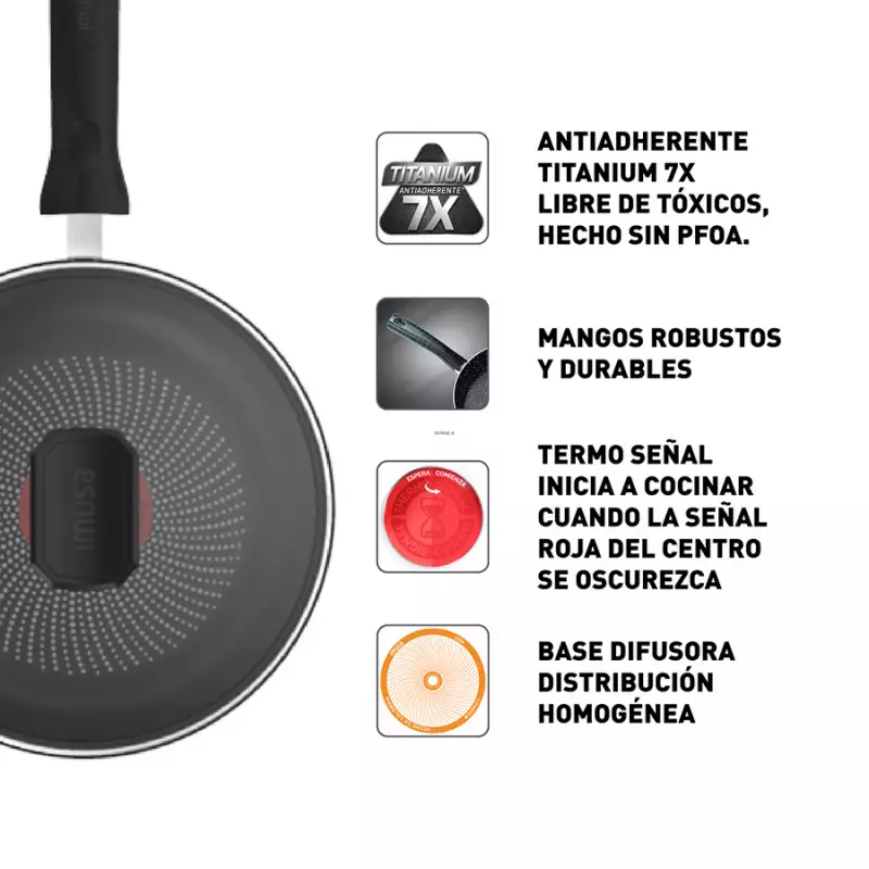 Cacerola con Tapa de Vidrio16 cm Negro: *Antiadherente Titanium 7X, el antiadherente más durable de IMUSA, resiste hasta 35.000 pasadas de esponja. *Tecnología termo señal que oscurece su color para indicar el momento adecuado para empezar a cocinar. *Hecho sin PFOA, Plomo ni Cadmio. *Mangos, asas y pomos robustos y durables. *Base difusora para una distribución uniforme el calor y resultados perfectos. *Antiadherente interior y exterior para una mayor facilidad al lavar.