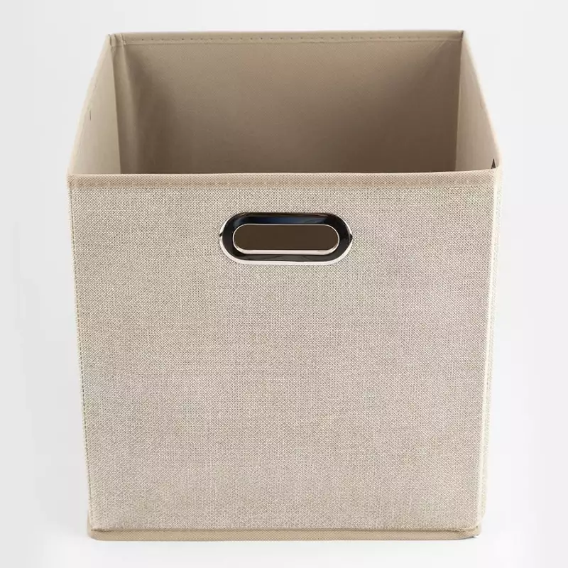 Caja de tela elaborada en polipropileno no tejido. Superficie lisa. Contraste mate. Forma cuadrada. Color beige. Tiene asa en la parte frontal. En la parte inferior tiene cremallera y fondo. Practica. Organizadora. Para todo tipo de objetos. Elaborada en China.