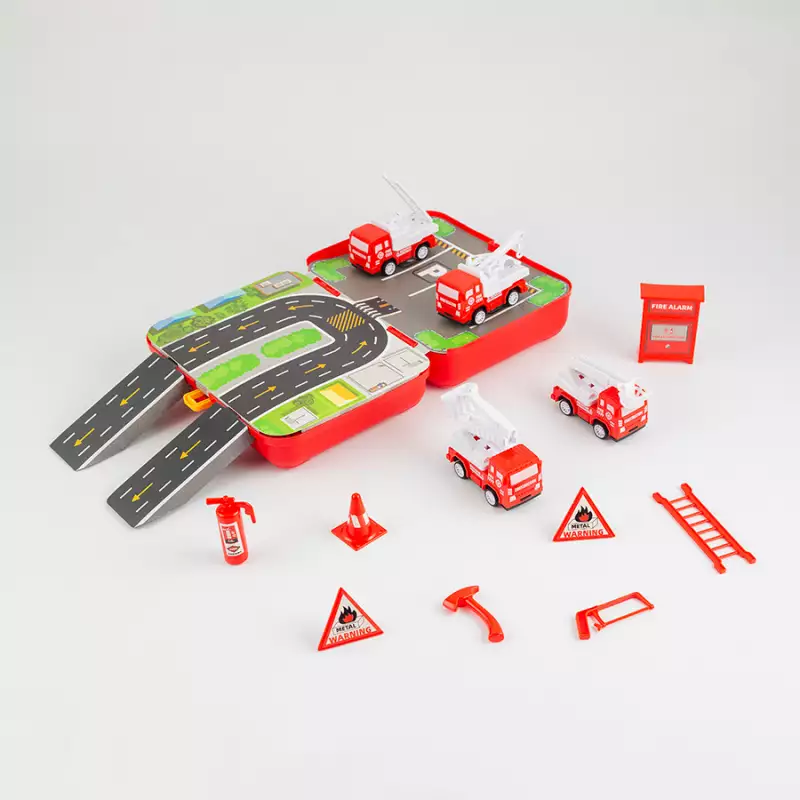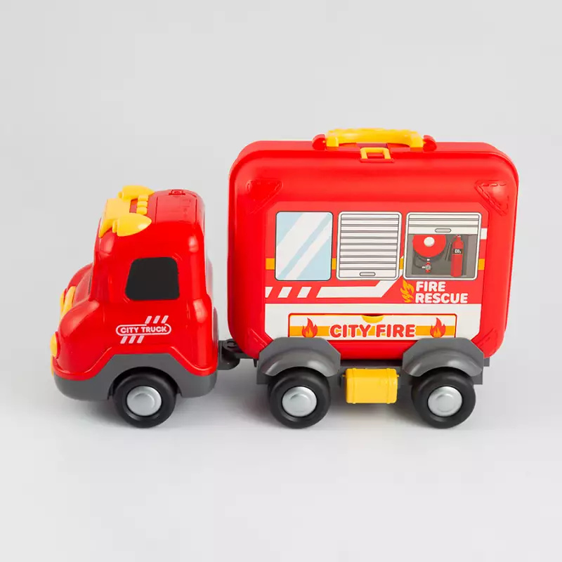 Carro de bomberos con sonido y luz, entretenimiento divertido con horas interminables de distracción sana, ayuda a los niños a desarollar su coordinación manos ojos, destreza, habilidades motoras finas y estimula la imaginación, fábricado con plástico de calidad, incluye 1 caja diseño maleta bomberos, 1 tarjeta, 4 camiones, 9 herramientas de incendio, 1 sticker, y 3 tarjetas de circulación, requiere 3 pilas AA no incluídas , dimensiones del producto 40.6x15.9x26cm. Edad recomendada de uso mayor de 3 años.