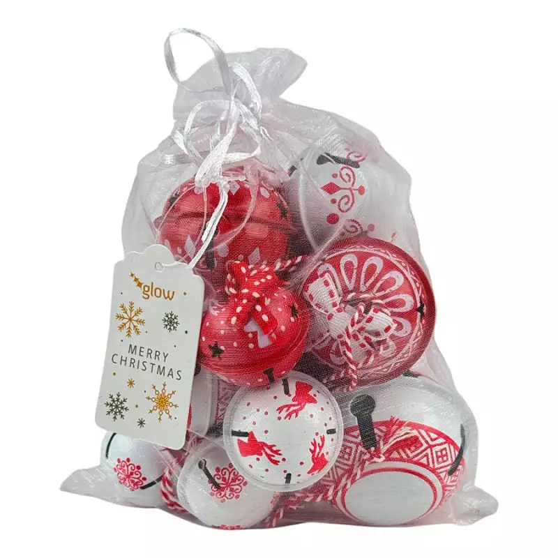 Set de 16 cascabeles de 6x6 cm elaborados en hierro, color rojo. Perfectos para decorar árboles, coronas y manualidades navideñas.