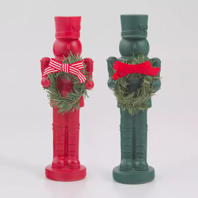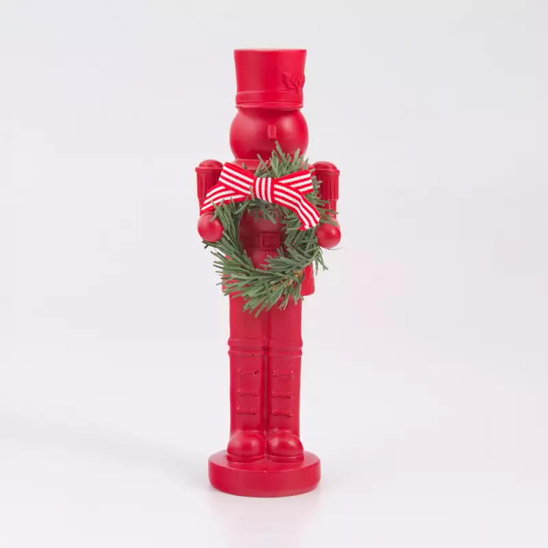 Disponibles en un surtido de colores rojo y verde, cada figura está cuidadosamente elaborada en material resistente y decorada con una corona navideña adornada con un lazo de tela que resalta su estilo tradicional.