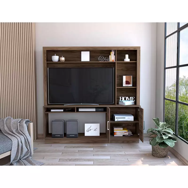 Centro de entretenimiento con apmlios espacios para almacenar, entrepaños, capacidad para TV de 55", color Coñac