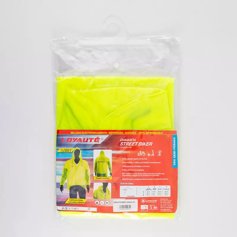 Material suave, no adquiere mal olor. Pvc siliconado calibre 8. Reforzada en la zona de las axilas. Color amarillo limón. Para uso a la intemperie. Es ideal para movilidad en bicicleta, patineta eléctrica y para uso casual.
