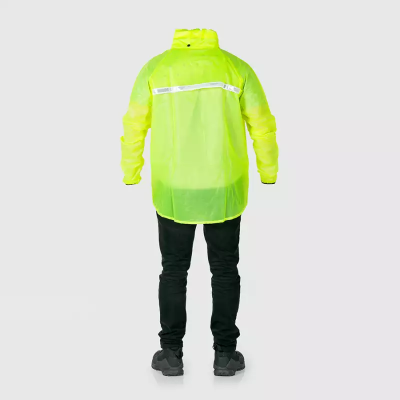 Chaqueta impermeable sellada por electro-frecuencia. Doble cierre de cremallera y broches con falsa espalda, perforaciones para ventilación y reflectivo. Más larga atrás para guarda-barros y corta adelante para que no se empoce el agua al pedalear. Cuello guarda-capota y puños con caucho.