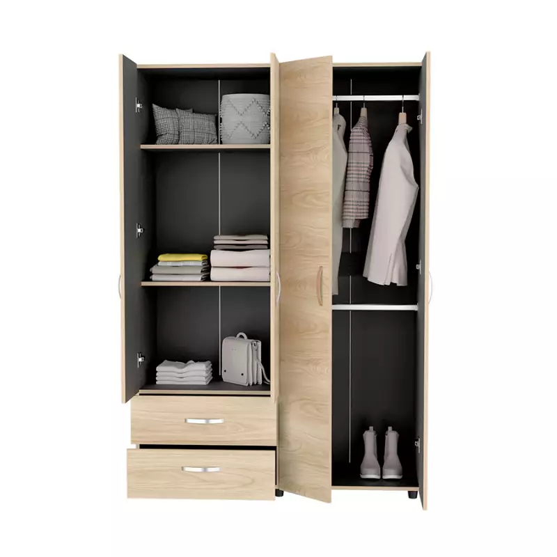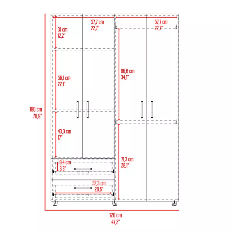 Closet, con 2 tubos cromados, 4 puertas abatibles, entrepaños para poner ropa, y 2 cajones organizadores.