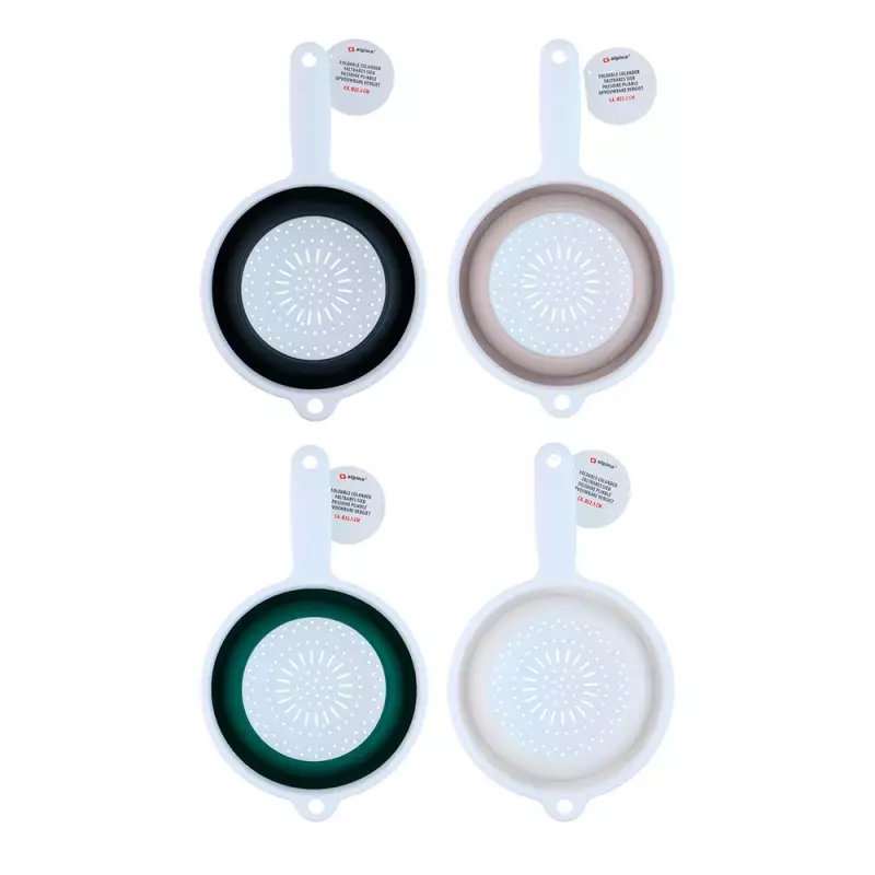 Colador Plegable Alpina De 22.5 Cm. Fabricado En Polipropileno Y Caucho Termoplástico. Colores Surtidos. Plegable, Lo Que Facilita Su Almacenamiento Y Permite Ahorrar Espacio En Cajones O Colgarlo Fácilmente. Ideal Para Acampar O Para Cocinas Pequeñas. Su Práctica Asa Ofrece Un Agarre Seguro Al Escurrir Pasta O Enjuagar Frutas.