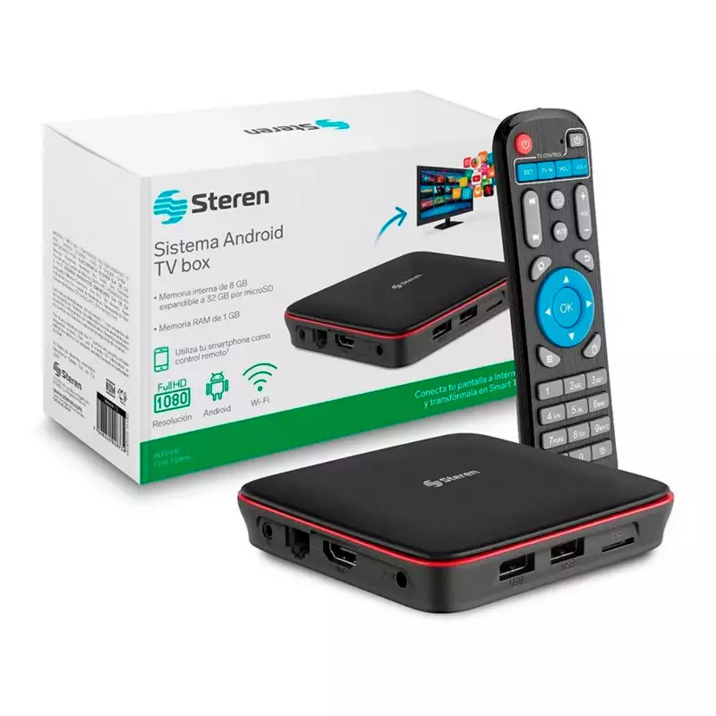 ¡Transforma tu pantalla en una Smart TV! Este equipo le dará a tu pantalla la capacidad de recibir señal desde un módem, ya sea por Wi-Fi* o por cable Ethernet, para que puedas tener acceso a Internet y reproducir contenido multimedia (como videos, películas y música). Tiene memoria interna de 8 GB y una memoria RAM de 1 GB. Incorpora 2 entradas USB, un puerto MicroSD* para extender la memoria, una salida HDMI* con resolución Full HD, una salida A/V 3,5 mm y una entrada RJ45 para el módem. Incluye control remoto para que navegues de forma cómoda y sencilla. NOTA IMPORTANTE: Algunas apps requerirán controlar con teclado o mouse adicional al control remoto del equipo. Mini Android PC Control remoto Wi-Fi / Ethernet Ranura para memoria externa Procesador Quad core Alimentación: 5 V--- 2 A Procesador: Quad Core Velocidad del procesador: 1,5 GHz Memoria RAM: DDR3 1 GB Memoria ROM: 8 GB compartido con OS Ranura de expansión: Hasta 32 GB Wi-Fi: 802.11 b/g/n Resolución máxima: Full HD Decodificador de video: MPEG-1, MPEG-2, MPEG-4, H.265, H.264, VC-1, DivX, avi, mpg, vob, rmvb, mkv, 3GP, FLV Temperatura de operación: 0 °C a 40 °C Humedad relativa: <90% no condensada control Remoto: 3 V--- (2xAAA) Convertidor de voltaje: 100-240 V~ 50-60 Hz 300 mA Salida: 5 V--- 2 A Consumo: 8 W/h Consumo en espera: < 1 W/h