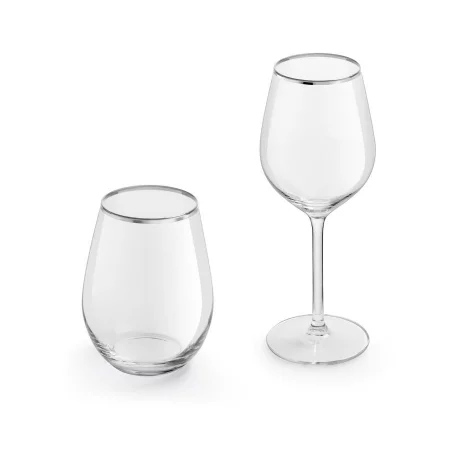 Set x 8 copas con borde plateado Incluye : 4 copas de vino 4 vasos Material: Vidrio Color: Transparente con borde plateado Marca: Royal Leerdam Medidas: Copas H 20cm- Diametro 7cm Vasos H 9cm- Diametro 7cm Capacidad: Copas 380 ml Vasos 290 ml Apto para Lavavajillas No apto para horno microondas