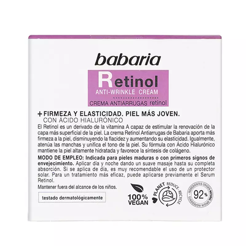 El Retinol es un derivado de la vitamina A capaz de estimular la renovación de la capa más superficial de la piel. La crema Retinol Antiarrugas de Babaria aporta más firmeza a la piel, disminuyendo la flacidez y aumentando su elasticidad. Igualmente, atenúa las manchas y unifica el tono de la piel. Su fórmula con Ácido Hialurónico mantiene la piel altamente hidratada y favorece la síntesis de colágeno Uitlizar unicamente en la noche