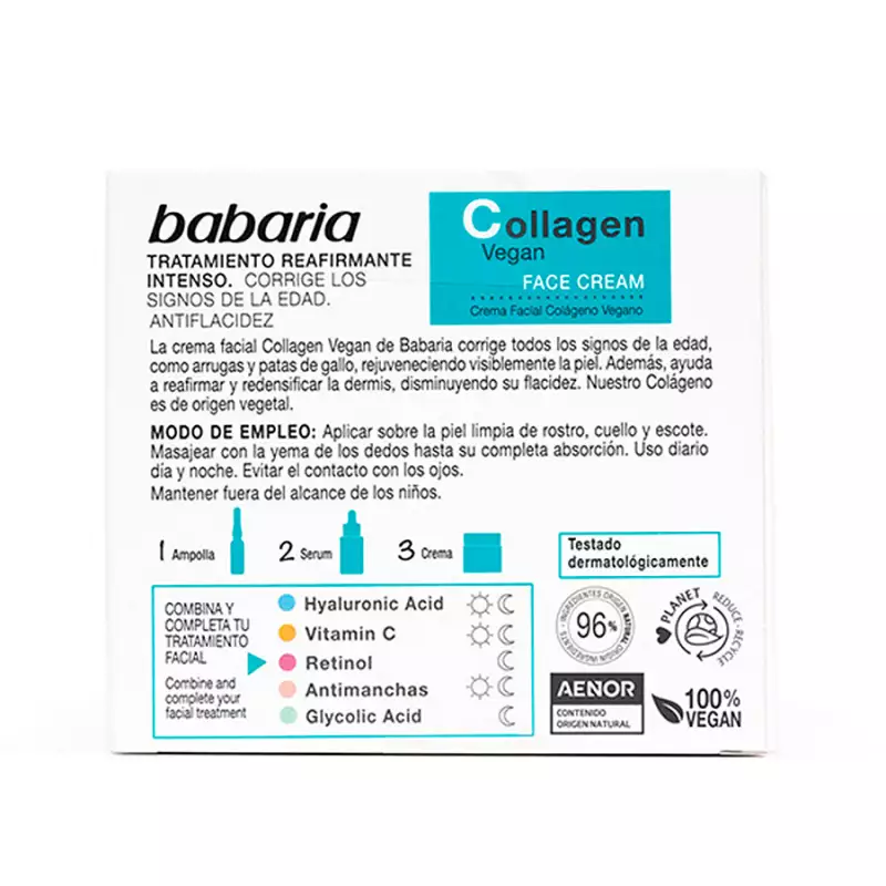 La crema facial Collagen Vegan de Babaria corrige todos los signos de la edad, como arrugas y patas de gallo, rejuveneciendo visiblemente la piel. Además, ayuda a reafirmar y redensificar la dermis, disminuyendo su flacidez. El Colágeno no es de origen animal, sino que, gracias a la investigación, hemos seleccionado un activo obtenido de plantas silvestres. Utilizar dia y noche