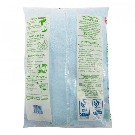 Detergente elaborado con ayudas de proceso, tensoactivos, ablandador de agua, intensificadores de limpieza, agentes antirredepositantes, bicarbonato de sodio, ayudantes esteticos, colorante, Color azul, En polvo, Con bicarbonato y manzana, Efectivo, Contenido de 2000gr, Registro NSOH05677-16CO , Elaborado en Colombia. Evite el contacto con los ojos. Presentación en Polvo. Elaborado en Colombia.