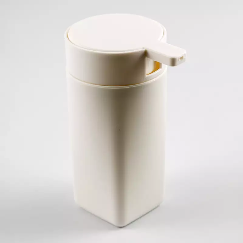 Dispensador de polipropileno en color blanco, con dimensiones de 9x14x7 cm, resistente y duradero.