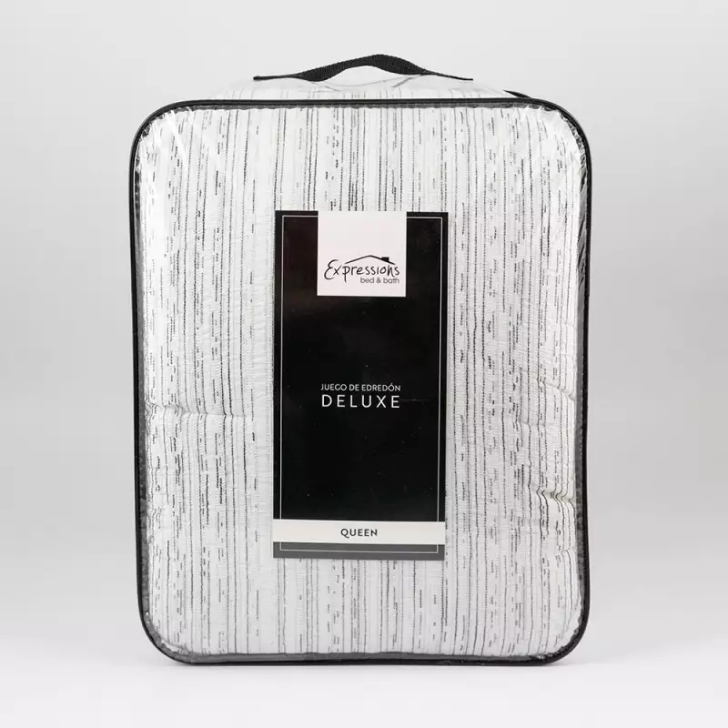 Edredón Expressions Queen 190x160 cm, fabricado en poliéster de alta calidad. Ofrece calidez y confort ideales para noches frescas, con un diseño elegante que aporta estilo moderno a cualquier dormitorio. Su tamaño queen es perfecto para camas grandes y es fácil de cuidar y mantener.