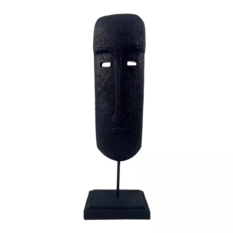 Figura decorativa Monocromía 7,4×34×11,3 cm, con diseño de máscara en color negro. Su silueta alargada y expresión abstracta aportan un acento escultórico de fuerte presencia visual. El acabado negro acentúa su carácter sobrio y elegante, integrándose con naturalidad en espacios contemporáneos, étnicos o de inspiración artística.