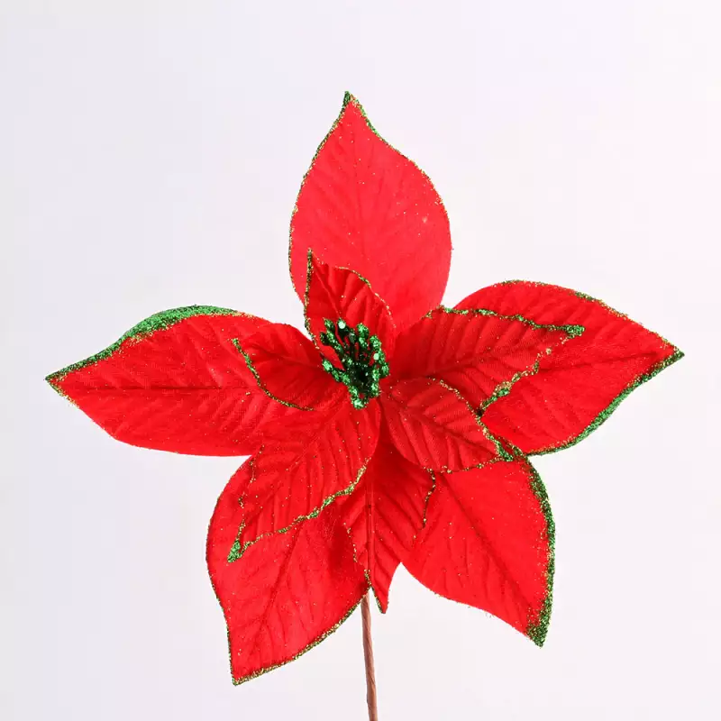 Flor miro christmas poinsettia de 30 cm, color rojo con verde, en tela. Ideal para decorar el árbol, coronas o arreglos navideños.