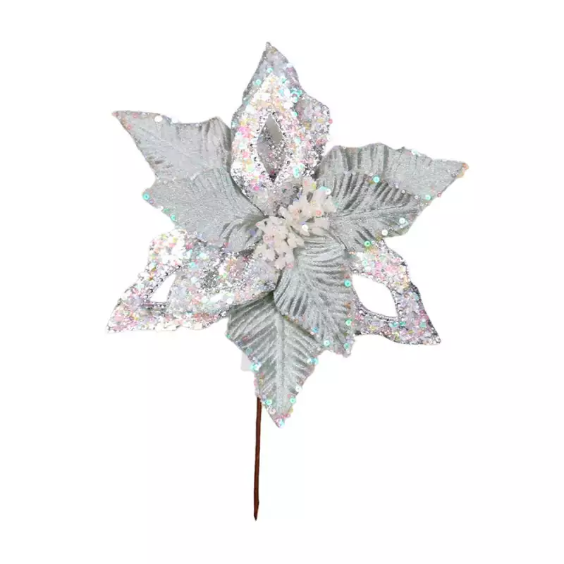 Flor Navideña decorativa 29X29X30Cm Santini, Material:Tela, Escarcha, Alambre, Goma, Color: Plata