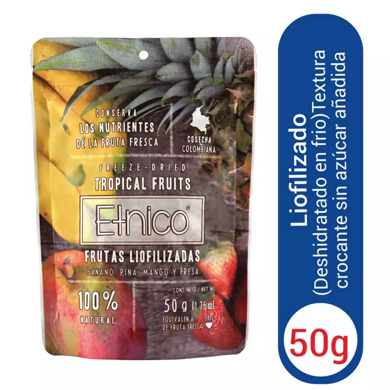 Mix tropical de frutas liofilizadas 50g, equivalente a una 500g de fruta fresca. Ingredientes: Banano, Piña, Mango y Fresa Usos: Ideal para consumir como pasabocas, en cereales, con yogurt, infusiones y ensaladas. La liofilización es un proceso de deshidratado donde extraemos apróximadamente el 97% del agua de la fruta a través de congelación y vacío, con esta técnica logramos conservar las propiedades nutricionales de la fruta fresca, asi como su sabor, color, aroma y aspecto; ademas esta adquiere una textura crocante.