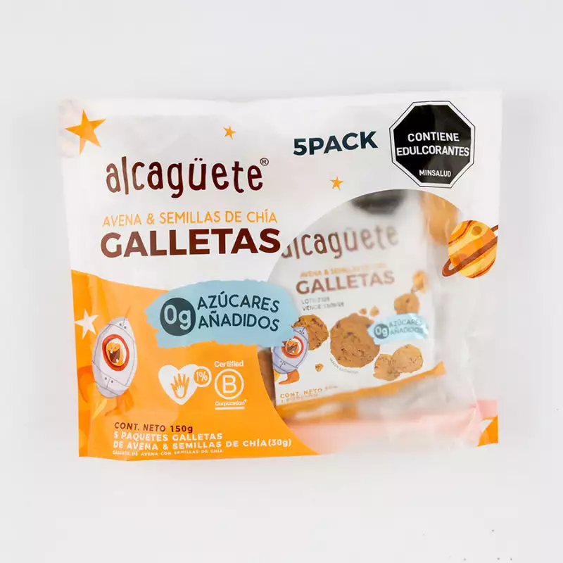 Galletas de avena y chia Alcaguete, hechas sin azúcar añadida y listas para disfrutar en cualquier momento. Ideales para llevártelas a la oficina o en tu lonchera y disfrutar de un delicioso snack saludable