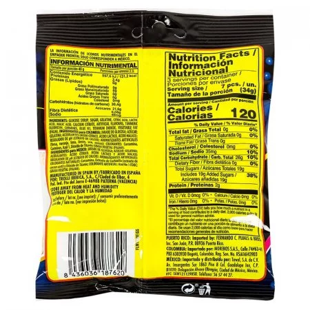 - Gomas elaboradas con jarabe de glucosa, azúcar, gelatina, ácido cítrico, humectante, sorbitol, aromatizante artificial, colorantes naturales y cera de carnauba.