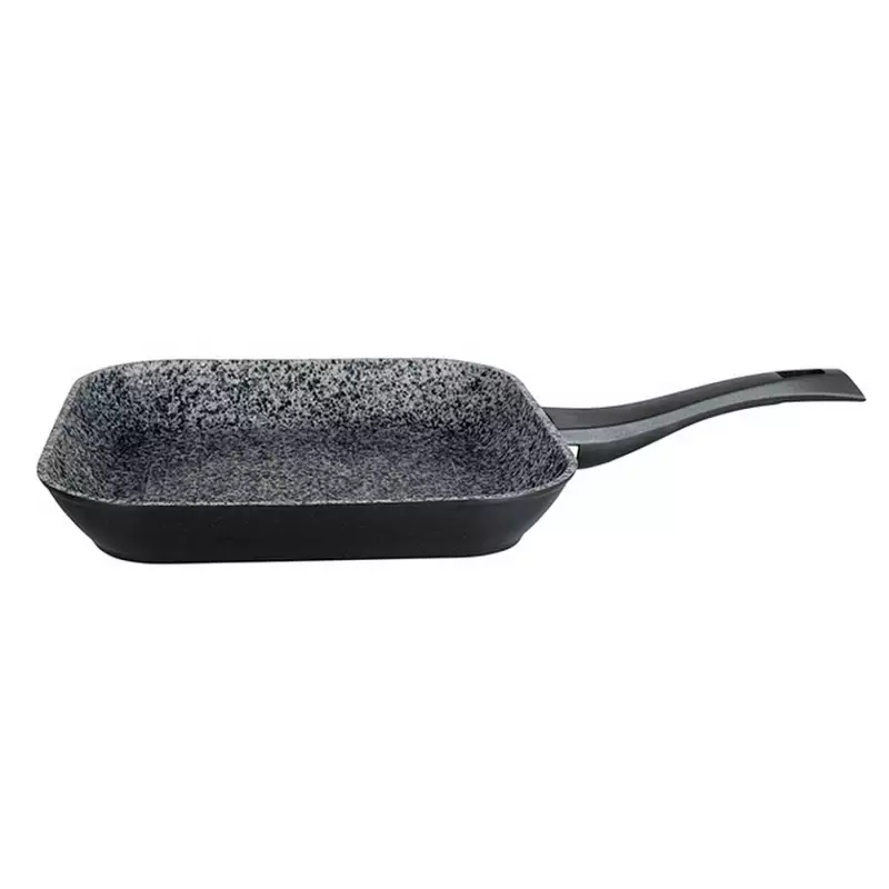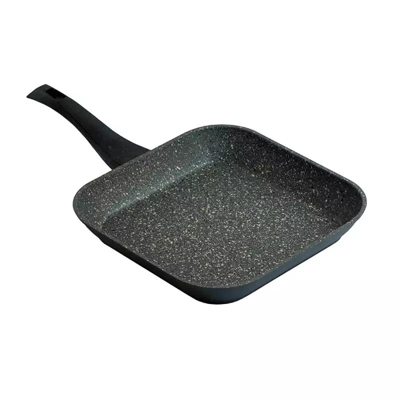 Grill Volcano de 28 cm, fabricada en aluminio forjado con 4 mm de espesor para una distribución eficiente del calor. El recubrimiento de 4 capas reforzadas proporciona una superficie antiadherente de larga duración. Apto para lavavajillas y se recomienda utilizar utensilios de cocina no metálicos para preservar la superficie antiadherente. No es compatible con cocinas de inducción.