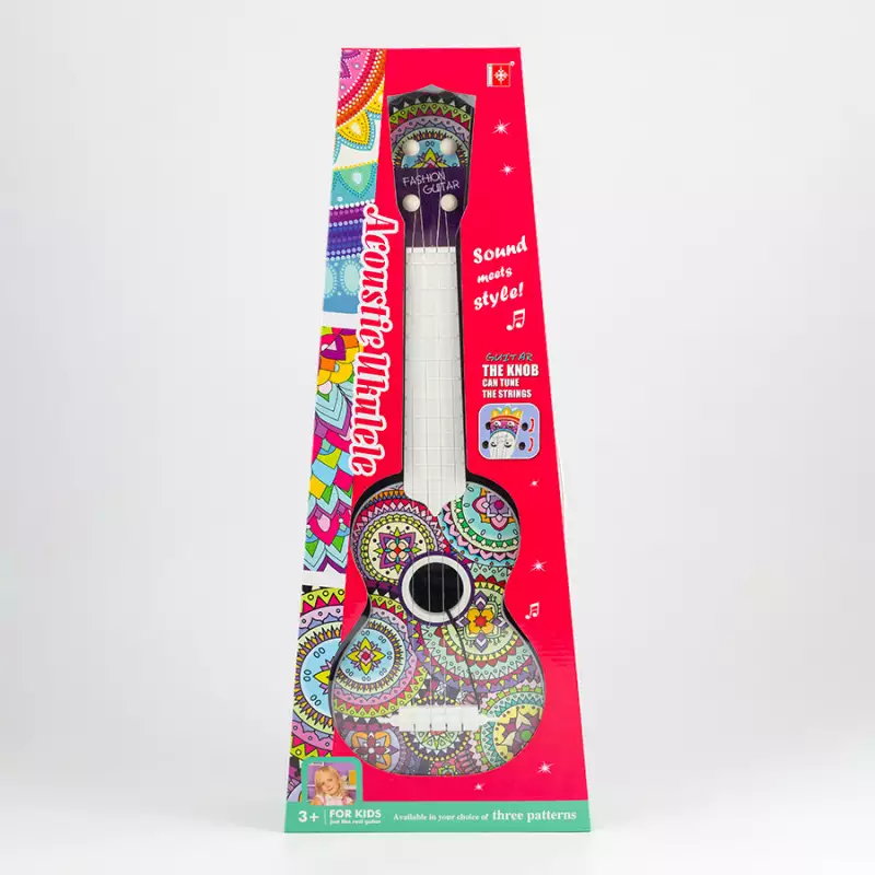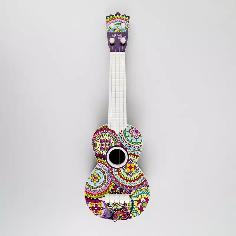 Guitarra diseño hippie, perfecta para introduccir a los niños en el mundo de la música, alienta a tus hijos a desarrollar habilidades auditivas y creativas, ideal como regalo, hecho de plástico de calidad, dimensiones del producto 59x24x8cm. Edad recomendada de uso mayor de 3 años.