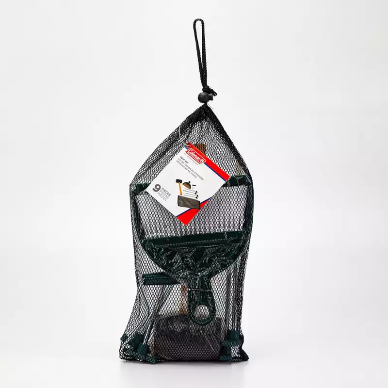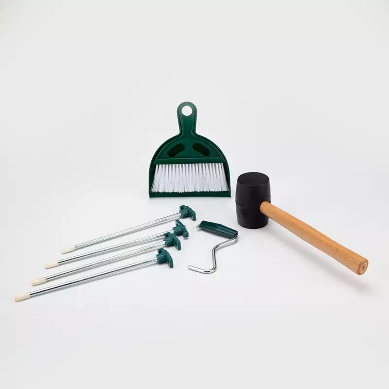 kit para acampar, con sus clavijas de acero junto al mazo permiten instalar carpas de camping sobre tereno, mantenga todo limpio con el recogedor y escoba de mano.