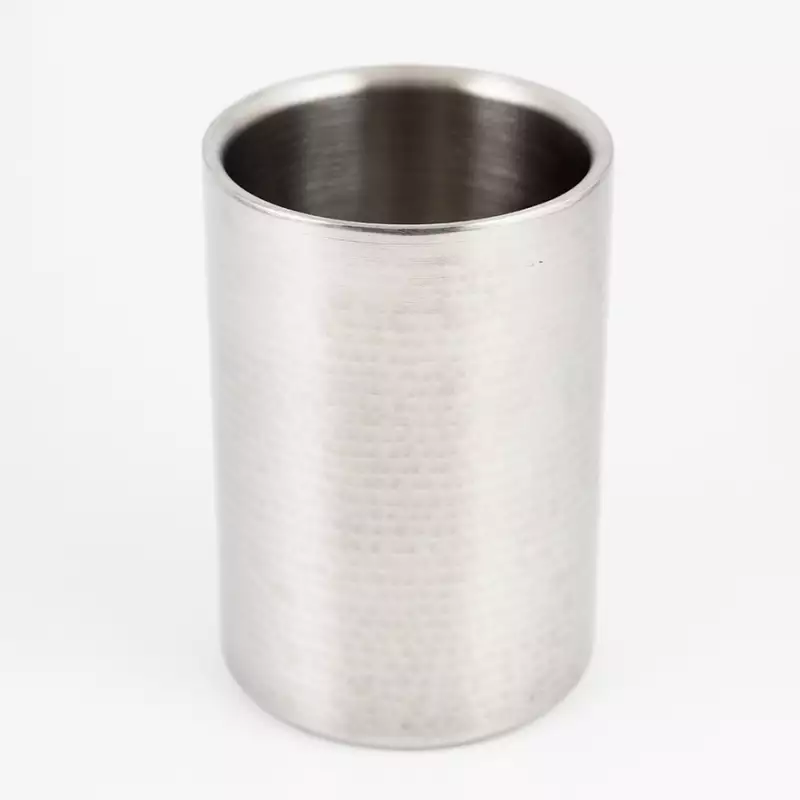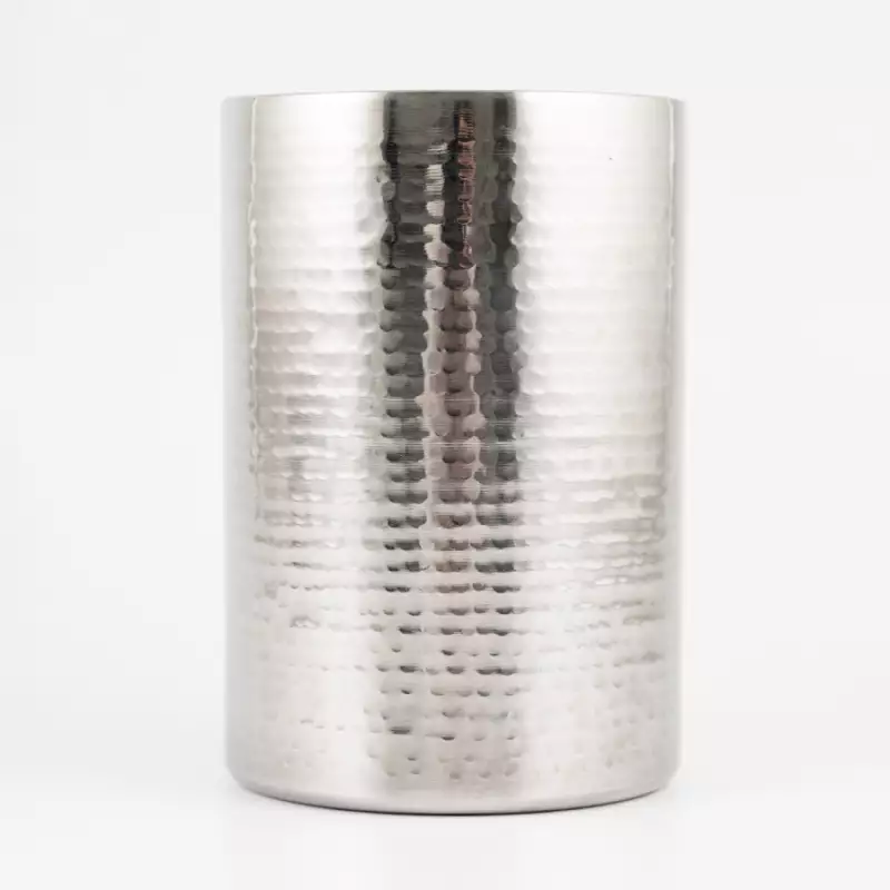Construcción de doble pared: La hielera cuenta con un diseño de doble pared que proporciona aislamiento para mantener el vino frío durante más tiempo. Esta doble pared ayuda a mantener la temperatura deseada del vino, asegurándose de que se mantenga fresco y refrescante. Material de acero inoxidable: Fabricada con acero inoxidable de alta calidad, la hielera ofrece durabilidad, resistencia a la corrosión y una apariencia elegante. Su construcción de acero inoxidable no solo realza la estética de la hielera, sino que también garantiza su resistencia al uso frecuente. Efecto martillado fino hecho a mano: Nuestra hielera está meticulosamente elaborada a mano con un efecto martillado fino, que añade un toque de elegancia y sofisticación a su mesa. Tamaño ideal: Con un diámetro de 121 mm y una altura de 174 mm, nuestra hielera está diseñada para albergar la mayoría de las botellas de vino estándar. Su tamaño compacto permite colocarla fácilmente en su mesa o barra, asegurando que su vino esté siempre a mano. Ligero y portátil: A pesar de su robusta construcción, el enfriador de vinos es ligero, lo que facilita su transporte. Puede llevarlo cómodamente a fiestas, reuniones o eventos al aire libre, asegurando que su vino se mantenga fresco dondequiera que vaya.