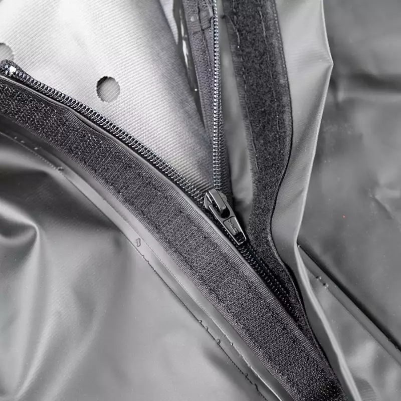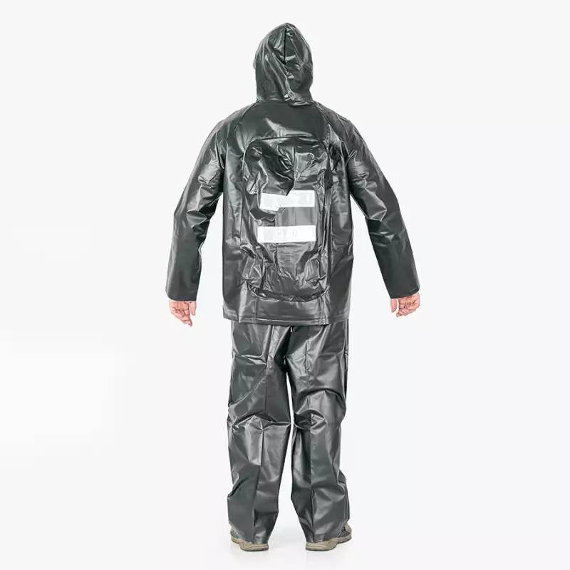 Conjunto impermeable sellado por electro-frecuencia. Chaqueta doble cierre de velcro y cremallera, con fuelles de expansión que hacen espacio al morral y 2 franjas reflectivas en la espalda. Pantalón con resorte en la cintura. Pvc con soporte poliester calibre 16. Contiene 2 piezas chaqueta y pantalón. Reforzado en la zona de las axilas y entrepierna. Color negro. Para uso a la intemperie. Ideal para movilidad en moto, bici o eléctrica.