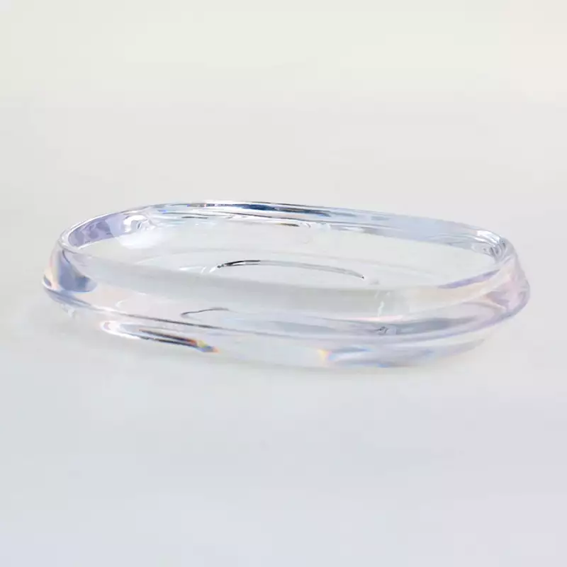 Jabonera transparente, con un diseño ovalado, que la da el toque de elegancia que necesitas para la decoracion de tu baño. Dimensiones: 12.4x9.4cm
