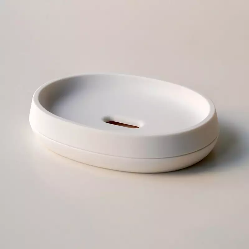 Jabonera color blanco, con diseño moderno y elegante. Dimensiones: 12.8x9.7xH.2