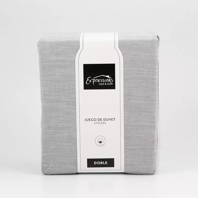 Juego de Duvet Expressions Doble 190x140 cm en color gris claro, confeccionado 100% en algodón de alta calidad. Brinda suavidad y confort excepcionales para un descanso reparador. Su tamaño doble es ideal para camas medianas y aporta un toque de elegancia y frescura al dormitorio