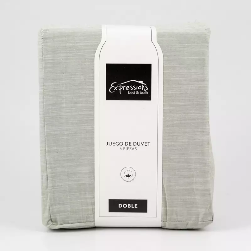 Juego de Duvet Expressions Doble 190x140 cm en color Verde, confeccionado 100% en algodón de alta calidad. Brinda suavidad y confort excepcionales para un descanso reparador. Su tamaño doble es ideal para camas medianas y aporta un toque de elegancia y frescura al dormitorio