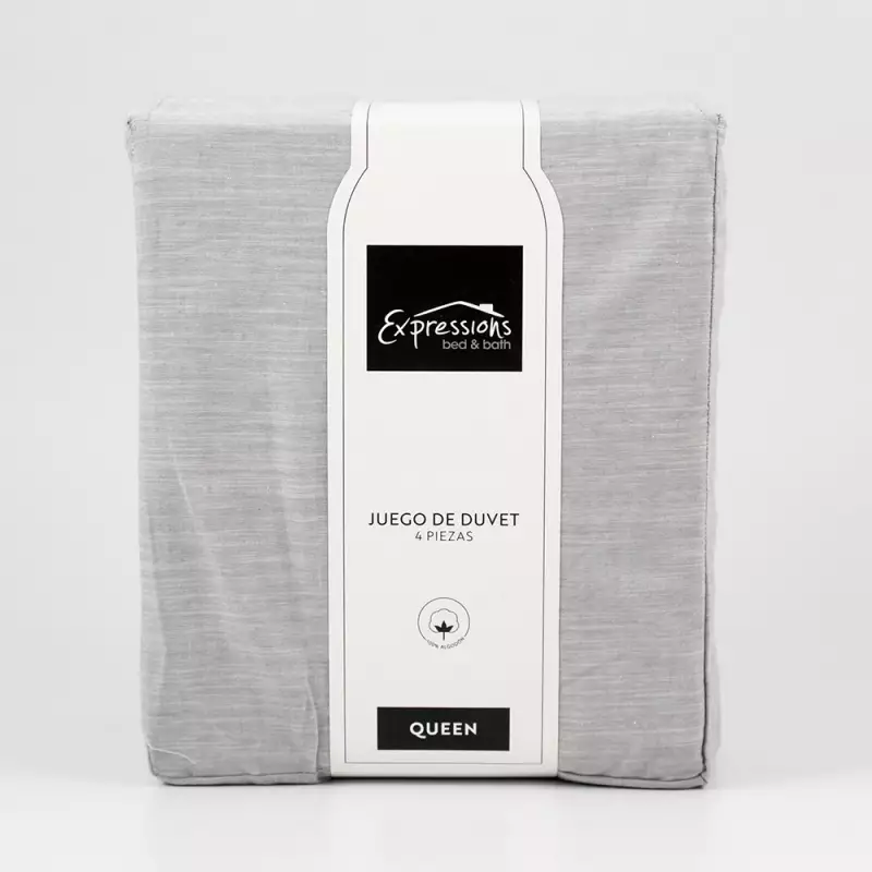 Juego de Duvet Expressions Queen 190x160 cm en color gris claro, confeccionado 100% en algodón de alta calidad. Ofrece suavidad y confort para un descanso óptimo. Su tamaño queen es perfecto para camas grandes, aportando elegancia y frescura al dormitorio. Producto durable y de fácil cuidado, ideal para quienes buscan calidad y estilo en textiles para el hogar.